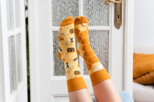 Skarpetki w pszczoły. Są to skarpetki asymetryczne – nie do pary, każda inna, jednak razem tworzą duet idealny.